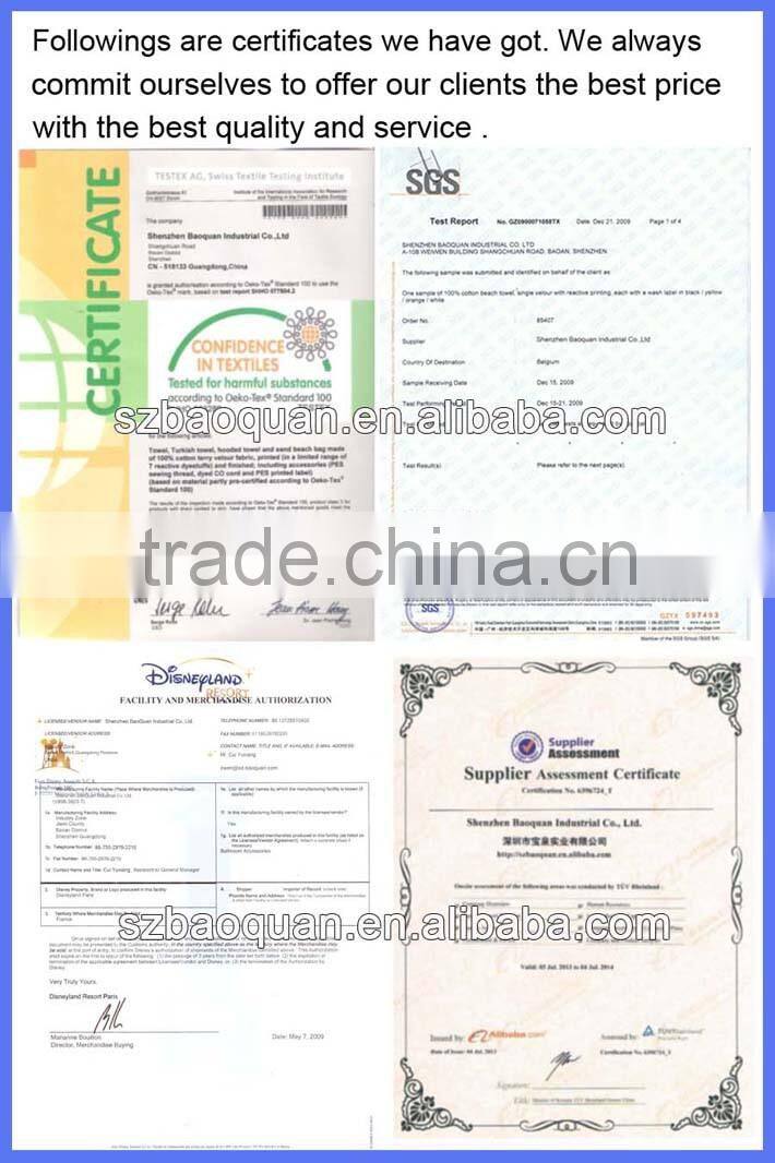 Established in 2003 , SHEN ZHEN BAOQUAN INDUSTRIAL CO., LTD is a manufacturer and trader specialized in the research, development and production of terry towel, beach towel, compress towel, jacquard towel, microfiber towel, hooded towel, bamboo towel, car washing microfiber cloth etc.We are located in SHENZHEN with convenient transportation access.All of our products comply with international quality standards and are greatly appreciated in a variety of different markets throughout the world.