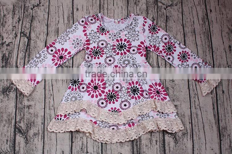 Latest Deisgn Wholesale Long Sleeve Pink Donut Print Wave Dress Spring Fall Lace Layered Ruffle Dresses Cheap Online Boutiques