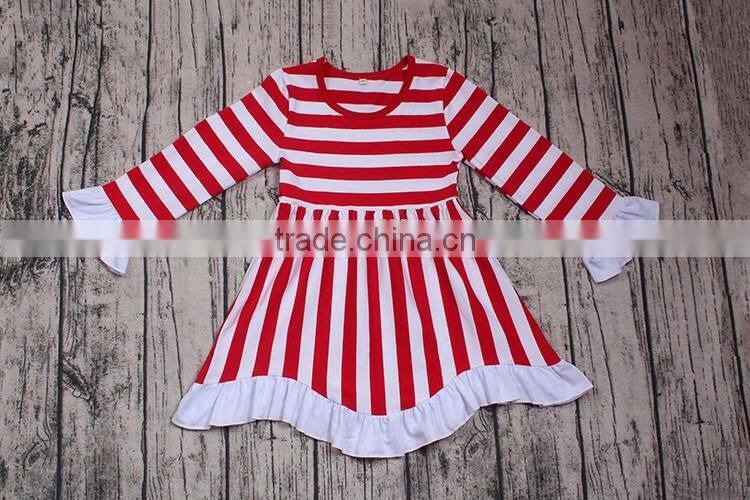 Popular Style Wholesale Cheap Girls Boutique Outfits Kids Long Sleeve White Red Striped Fancy Dress Baby Ruffle Wave Party Dress