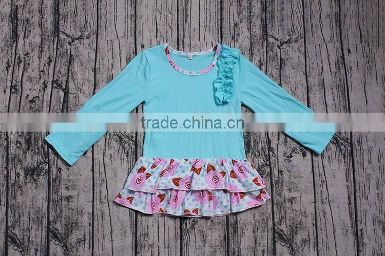 Cheap Wholesale Little Girls Long Sleeve T-shirt Blue Color With Flower Ruffles Boutique Outfits Fall Spring Basic Tops Tees New