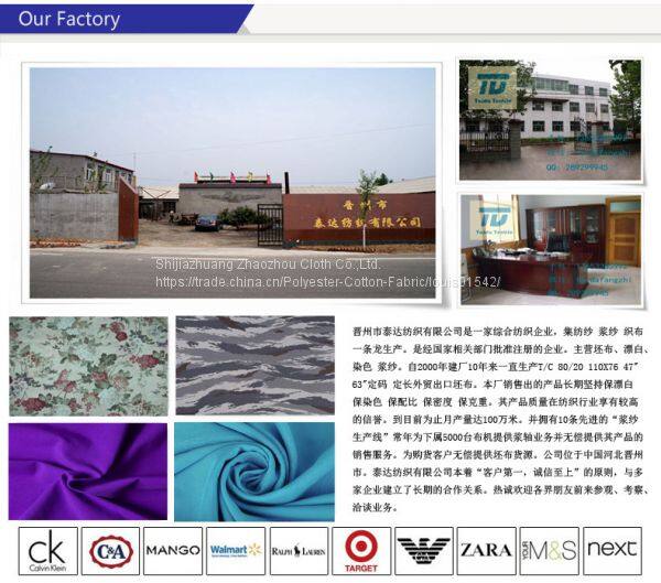 Our main products are as follows, T/C 65/35 80/20 90/10 45*45 133*72 63” 110*76 47” 63” 96*72 47” 63” 88*64 47” 63”,and T/C 80/20 21*21 108*58 63”, 20*16 120*60 63”, T/C 50/50 110*76 63”,96*72 63”.