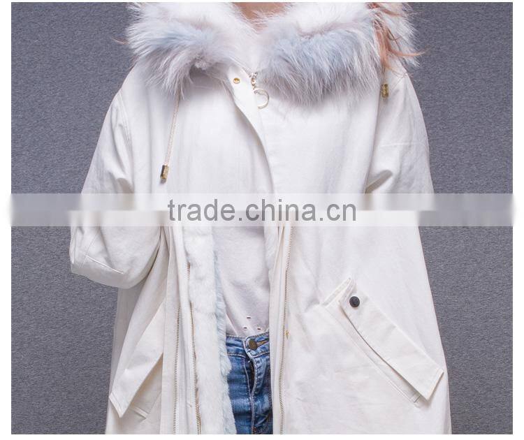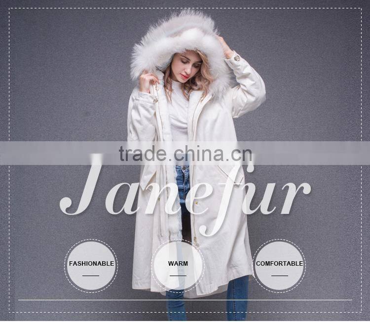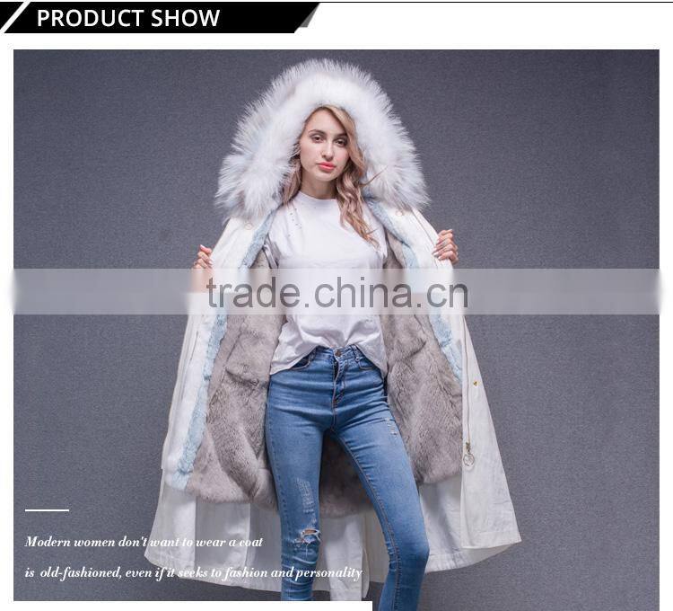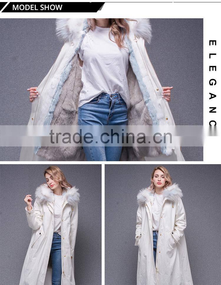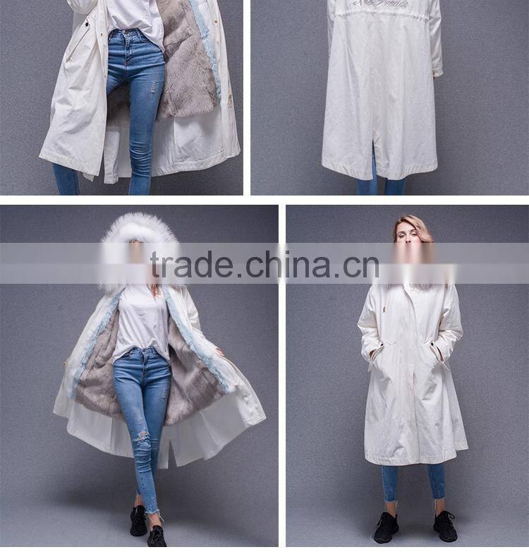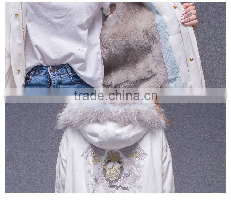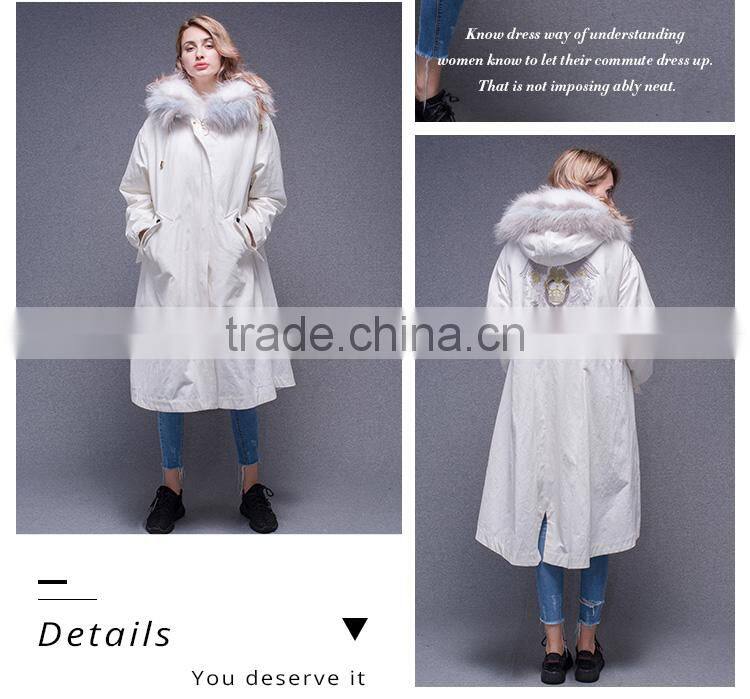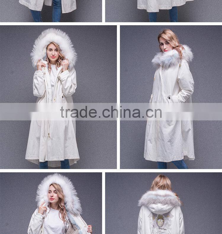 Lastest Design Winter White Coat Jacket Women Real Fur Lined Fur Parka With Fluffy Raccoon Hood and Embroidery