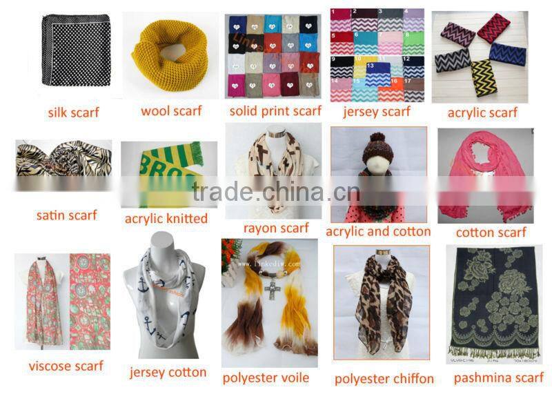 Our company have run business for 10 years in scarves and accumulated of experience in producing and developing.we specialized in foreign trade scarves design,proofing,OEM processing and scarves wholesale.the unique style and high quality is our advantage.Quality first and customer frist is our philosophy .Our scarves mainly as follows:knitted scarves series,yarn-dye scarves series, jacquard scarves series,printing scarves series,dyeing scarves series,etc.We assort these products to silk scarves,cashmere scarves,pashmina scarves,wool scarves,cotton scarves,acrylic scarves,polyester scarves,new blended scarves,and so on.