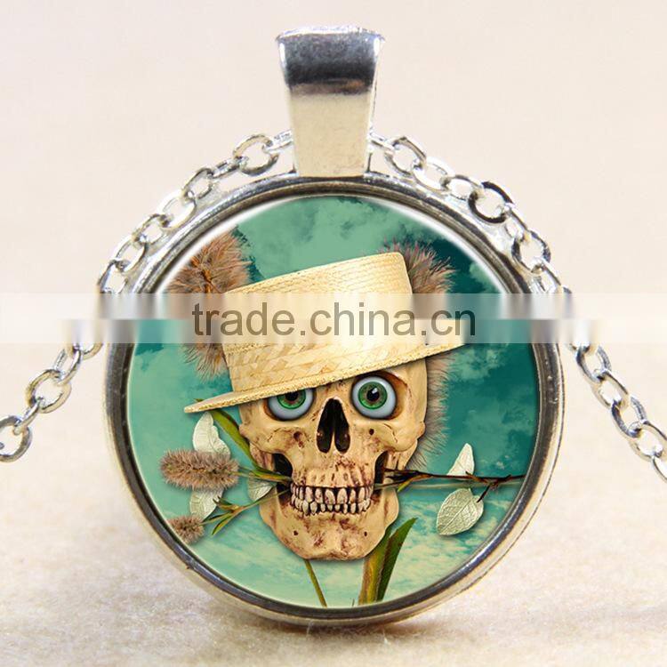 XP-TGN-S-142 2017 New Design Pendant Dome Round Glass Mandala Time Gemstone Silver Skull Cabochon Necklace In Glass