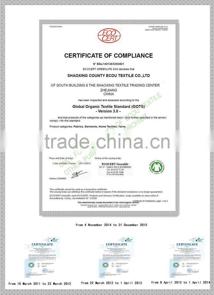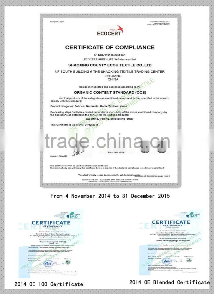 The shaoxing County Ecou Textile Co.,Ltd specialty products and design the organic cotton fabric and Bamboo fabric ,they can pass textile oeko-100 standard & Gots 3.0.