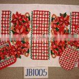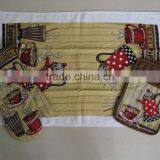 The factory specializes in the production of various kitchen textile, aprons, oven mittens, potholders, towels, table cloth, tablemats, table runners,napkin, bathroom mats, cushion covers, chair pads, iron board covers, bread baskets, bread bags, tea covers and so on. Presently, our products are sold all over the world especially in such countries as the USA, Europe, South America, the middle east, Australia and Japan.