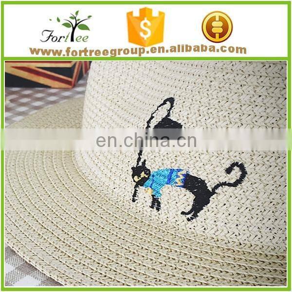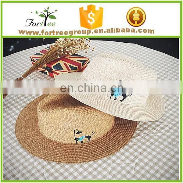 2016 new arrical straw fedora hats with cartoon embroidery