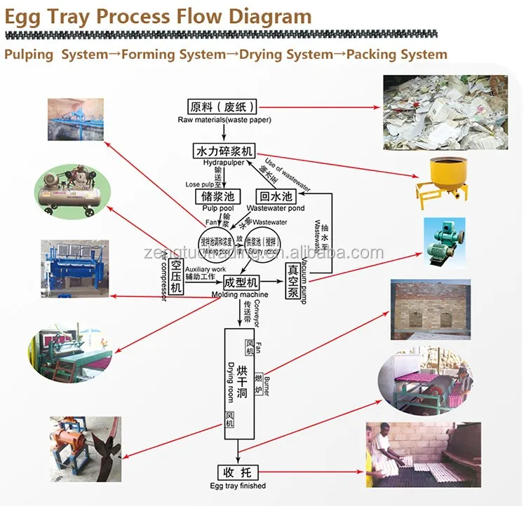 Egg Tray Machine (a kind of pulp molding machine) uses all kinds of waste paper as raw material and produce different kinds of tray products according to customers’ requirement,such as egg tray/dishes ,egg carton/box,fruit tray,industrial package tray,agricultural seeding tray ,wine tray ,shoe support and small products packages ,etc. The different final products are decided by your market choice.