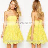 Customized Hot Fashion Short Shining Yellow Bandeau Fit Flare Strapless Satin Prom Dress