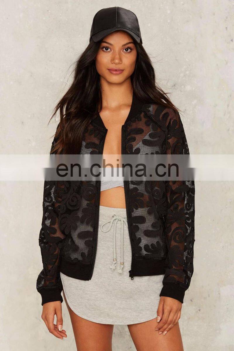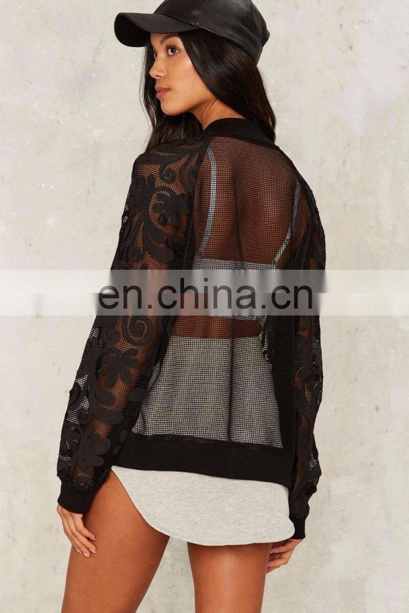 Black Mesh And Ribbed Contrast Hem Geometric Embroidery Throughout Bomber Jacket