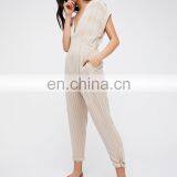 V-neckline Rolled Sleeves Cuffs Cute Knot Ankle Striped Jumpsuit