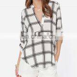 CHEFON Roll Tab Half Sleeve Deep v Neck Plaid Print Fashion Patterns of Chiffon Blouses