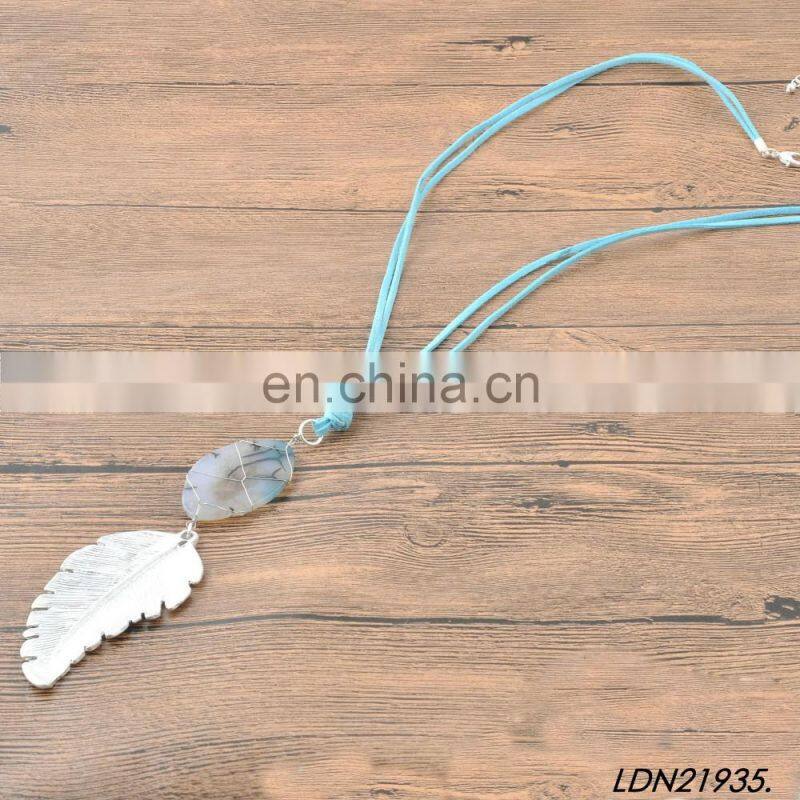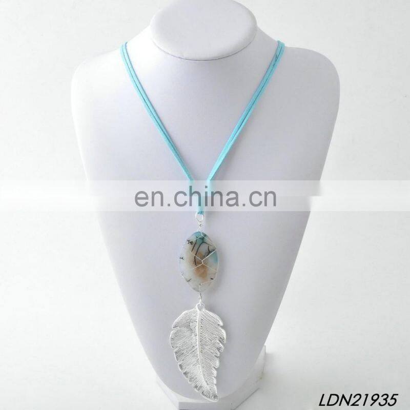 Genuine Agate Gemstone Gold and Silver Leaves Pendant Necklace Double Suede Leather Necklace Jewelry