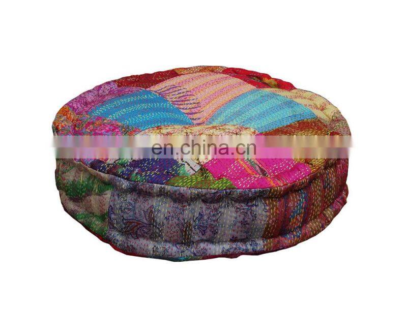 Silk Patchwork Round Floor Cushion Wholesale Silk Sari Patchwork Kantha Ottoman