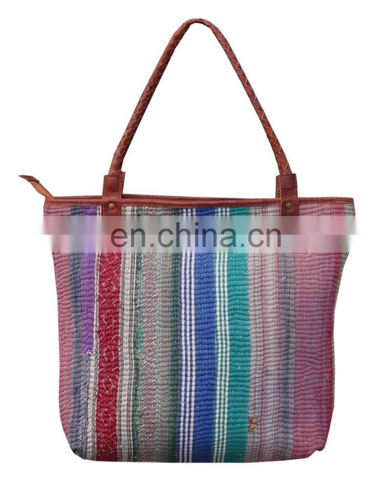 Wholesale New Arrival 2017 Kantha Hand Bag Vintage Leather Handle Kantha Tote Bag