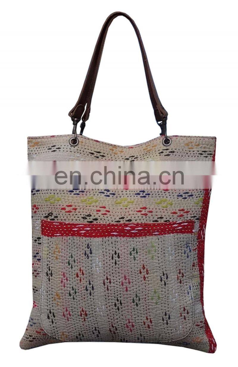 Wholesale New Arrival 2017 Kantha Hand Bag Vintage Leather Handle Kantha Tote Bag