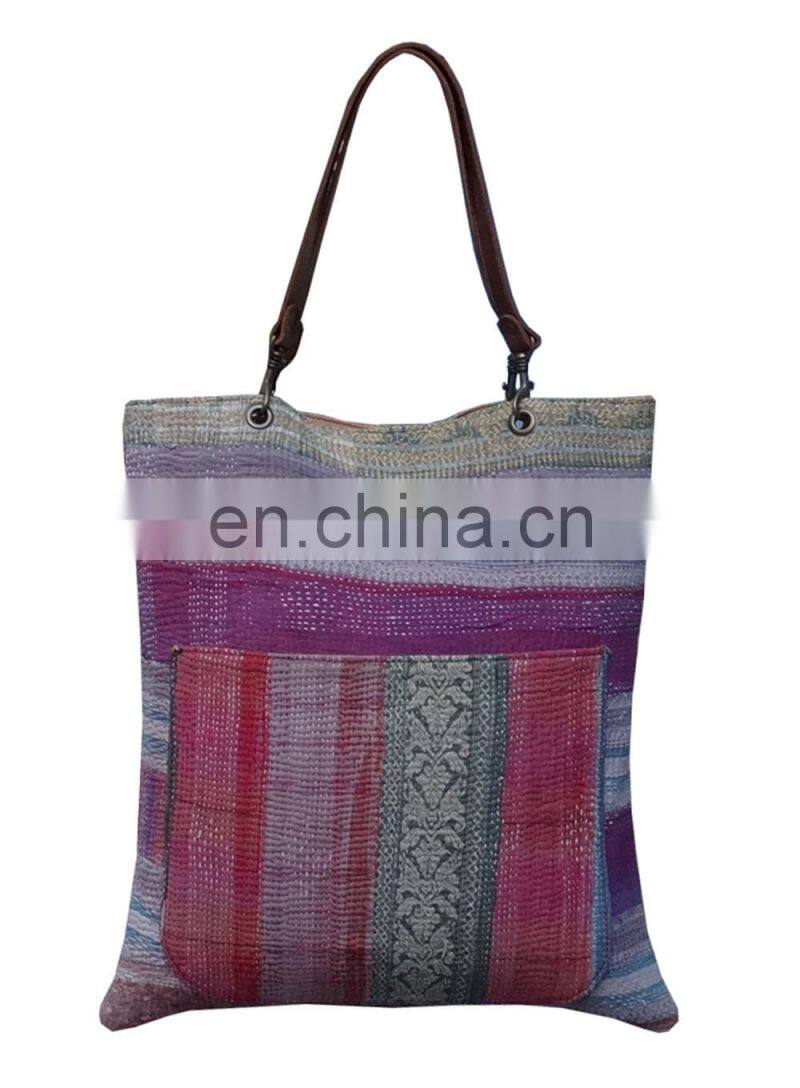 Wholesale New Arrival 2017 Kantha Hand Bag Vintage Leather Handle Kantha Tote Bag
