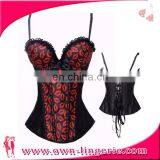 in Stock Printed Red Lips Waist Corset Black Lace Bustier Corset for Woman