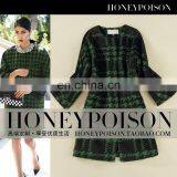 2014 European Style Green Houndstooth Horn Sleeve Woollen Overcoat Sexy Women Without Dress