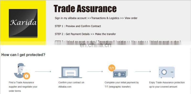 | Trade Assurance | A popular payment way, which Alibaba will protect every client's profile forever as long as use it one time. If there is any problem in quality etc when you got the goods, you are able to apply for compensation to Alibaba. The amount of compensation is even arrived to the total value of your items. |
