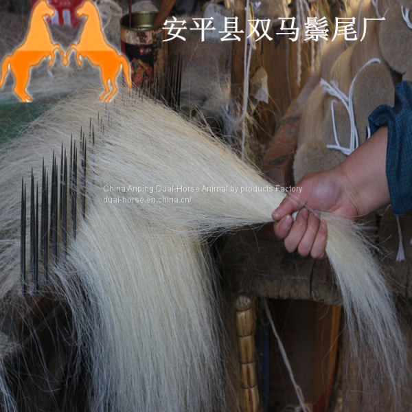 White double drawn horse tail hair for bow hairHorse tail hair are widely used for stringed instrument bow hair,woven lining cloth,industrial brush and craft making. It can be single side cutted type and double side cutted type. We supply several colors :mainly white, black, mixed, brown, grey, sorrel, dyed and so on, and various size :mainly 6-36" , 36" up we can supply also. We can supply single drawn and double drawn.Horse tail hair packing