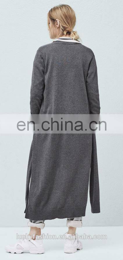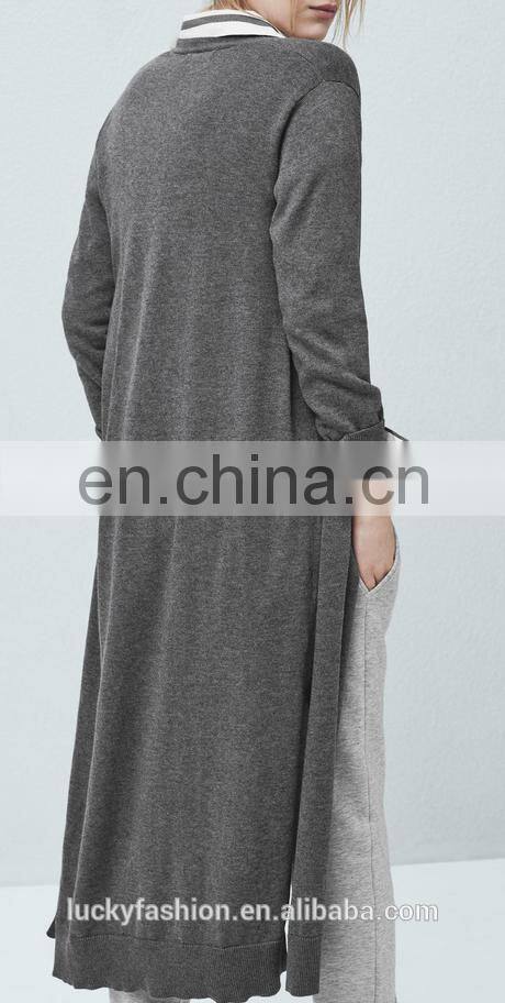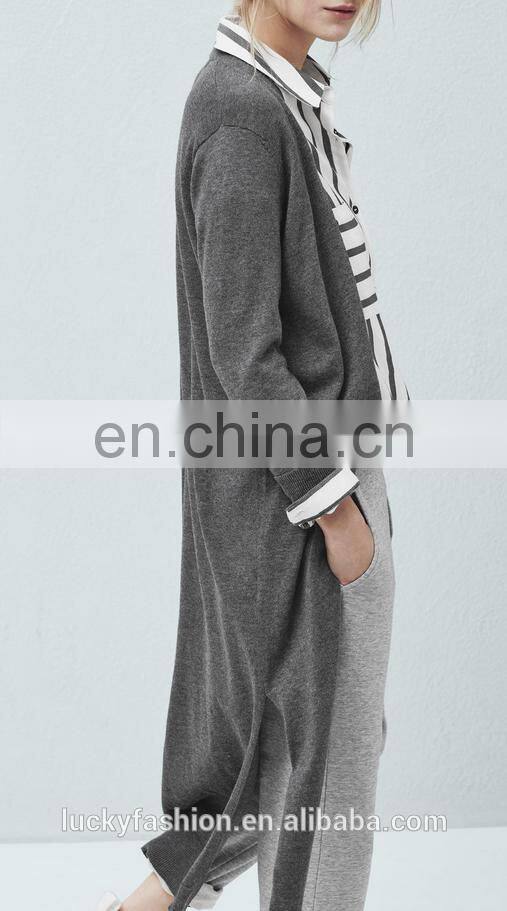 Lucky fashion is a clothing manufacturer, factory located in Guangdong, China. Lucky do OEM & ODM service. Customer could have their own design/logo on the item long cotton cardigan side slit hem women sweater. Lucky are able to help you to create new products and enrich your clothing line.