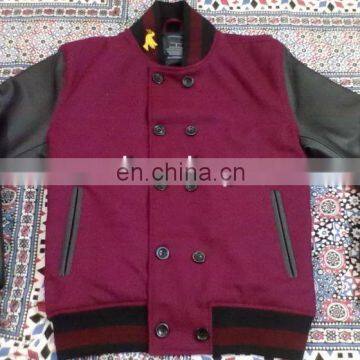 Varsity jacket in new style very graceful look double breasted in all colours of leather sleeves and wool body with tags and embThis is new style varsity jacket double breasted buttuns are inside and outside , very comfortable and fitted nicely emboidered on cuffs and collar.Almost all colors of 24 oz melton Wool and real leather is available.Heavy quilt inside 150 grm,hand stitched buttons infact an outstanding style of jacket with customized embroidery or tags