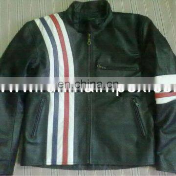 Motorbike leather jacket with stripes all way on the front in different colors nice quality leather watever required ( buffalo , cowhide ) in different thicknesses in all colors and sizes with inside quilt and zipper for pant to be attatched with on bottom