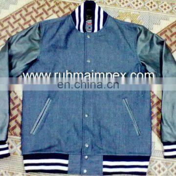 Denim jacket with nice quality different weights of denim and different types of washes to make it more attractive, leather sleeves in different nice quality leather all types of customised embroidery or printing labels and tagsetc