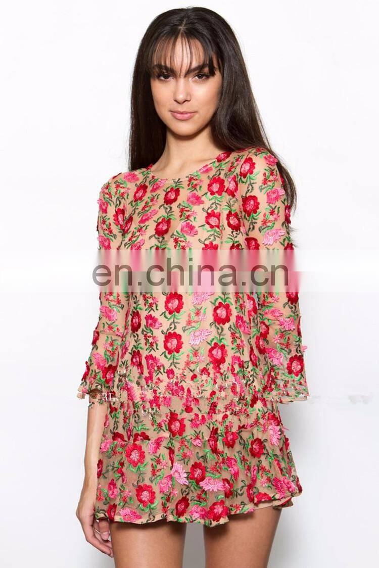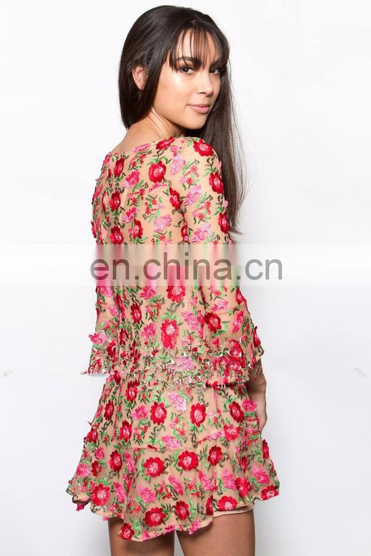 2017 Newly Flowers Embroidere Long Sleeve Sexy Transparent Lace Mini Evening Dresses for Women Party Wear