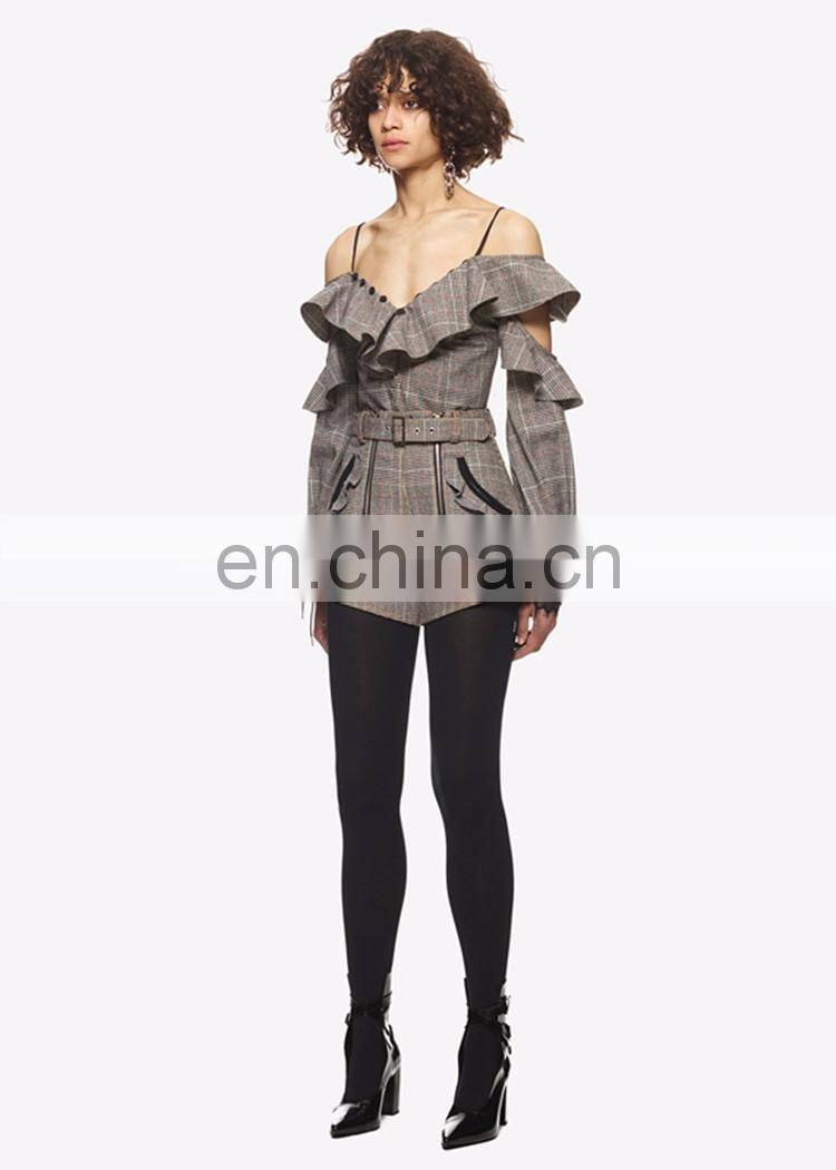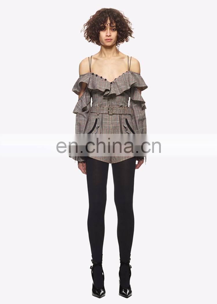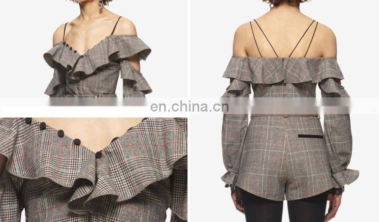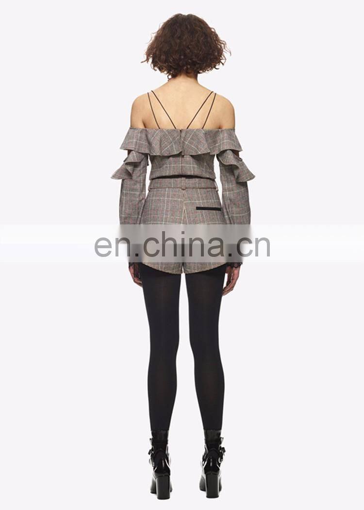 Amigo 2017 New Design British Style Checker Printed Strap Falbala Sleeve Mini Casual Jumpsuits for Women Out Wear