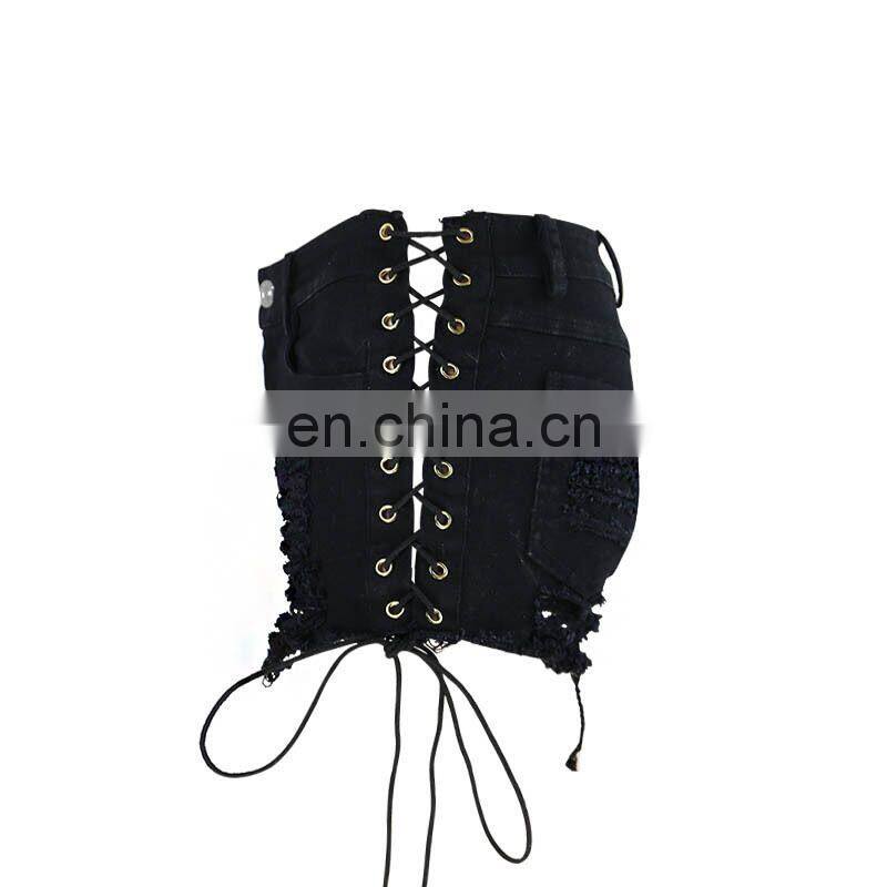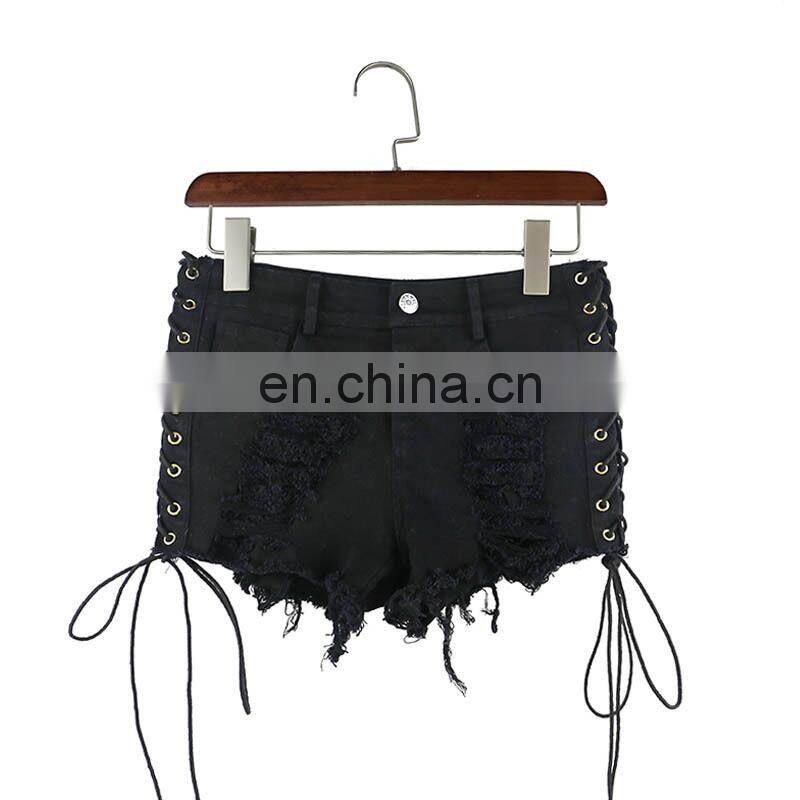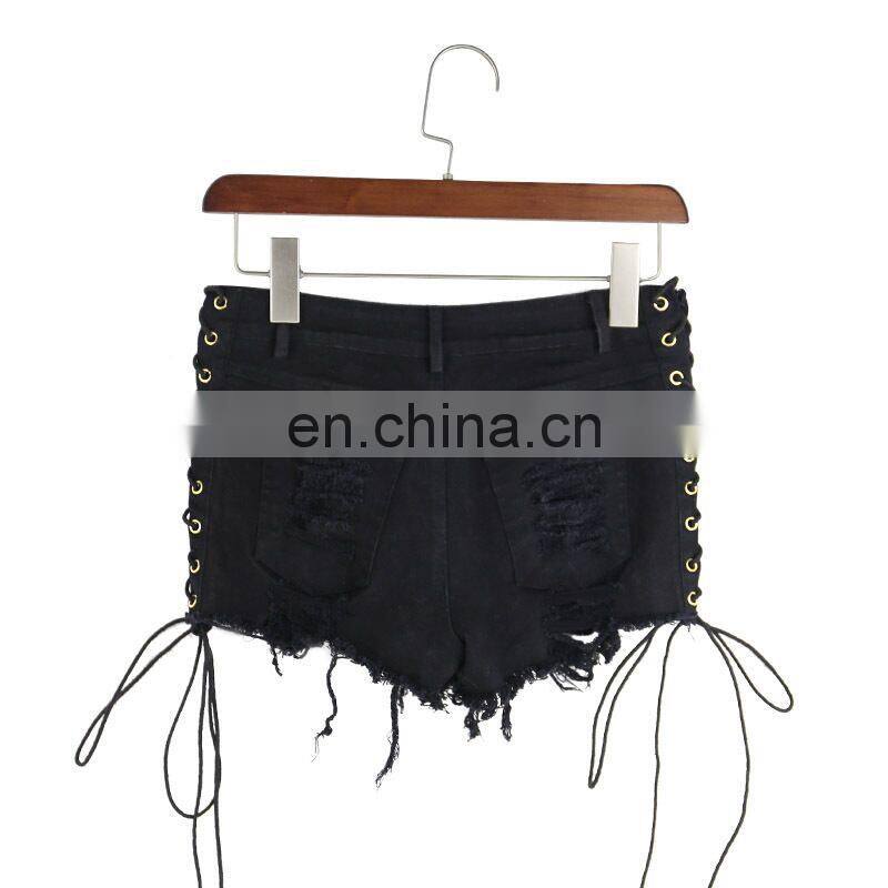 Black Sexy Short Jeans 100%cotton Tie Hollow Out Washed Hollow Out Mini Pant Wholesale