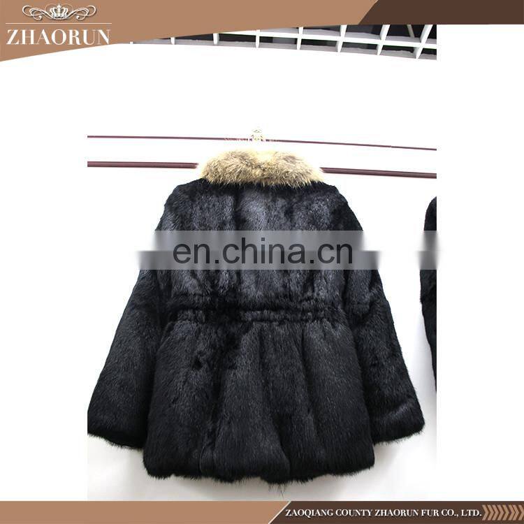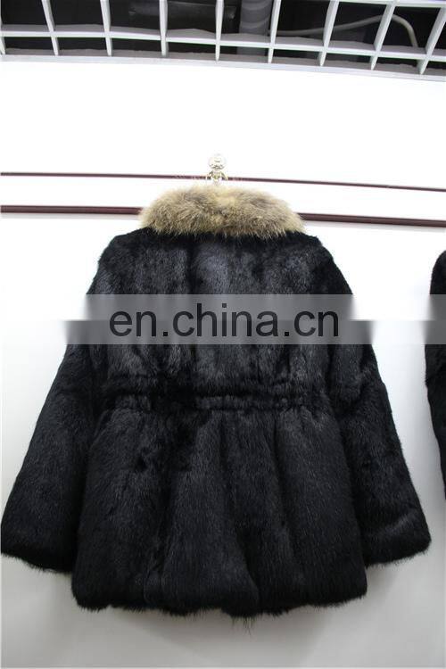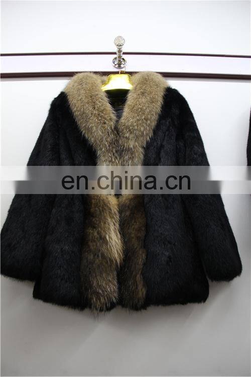 Wholesale Black Rex Rabbit Fur Coat Garment Rex Rabbit Fur Jacket With Raccoon Fur Hood