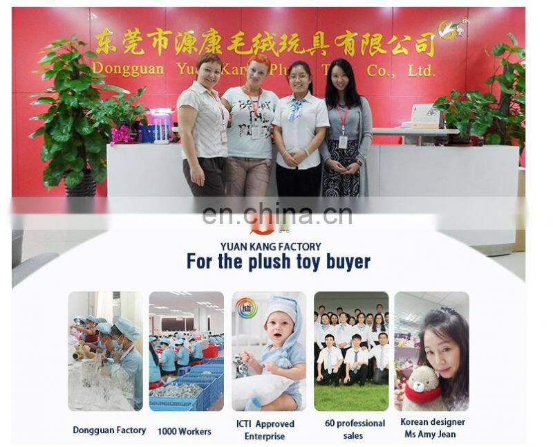 Dongguan Yuankang Plush Toys CO., LTD was established in 2002, we are located in the Chinese famous city, Dongguan, Guangdong Province. Our factory has hundreds of millions of annual turnover and has become the top supplier of OEM plush toys customization. The main OEM scope is: all kinds of stuffed toys, plush pillow(neck pillows and regular throw pillows), electronic products and embroidery, heat transfer, silk printing, trademarks and other processing services. We have more than 800 workers, the designers and managements have the experience of more than 10 years. Our cooperators have the international companies as Yili, Walmart, Coca-Cola, McDonald's, Kraft and other well-known enterprises at home and abroad. Our factory has successfully passed the ICTI, ISO, Disney, Wal-Mart and Global Security Verification audit, and we have the independent inspection and the right about import and export. The products are environmental and high quality with the best price. Our tenet: to help customers reduce costs and create value as the center! Wholeheartedly offer the most professional customized service for the general new and old customers. |