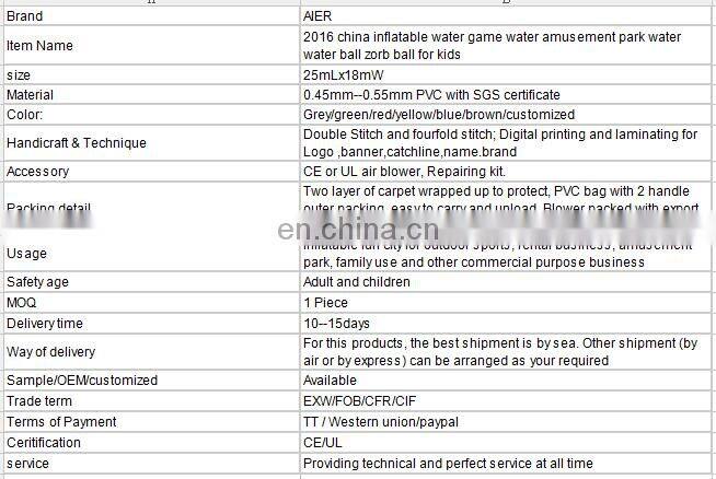 Home > Products > Inflatable Water Games > 2016 China Inflatable Water Game Water Amusement Park Water Water Ball Zorb Ball for Kids