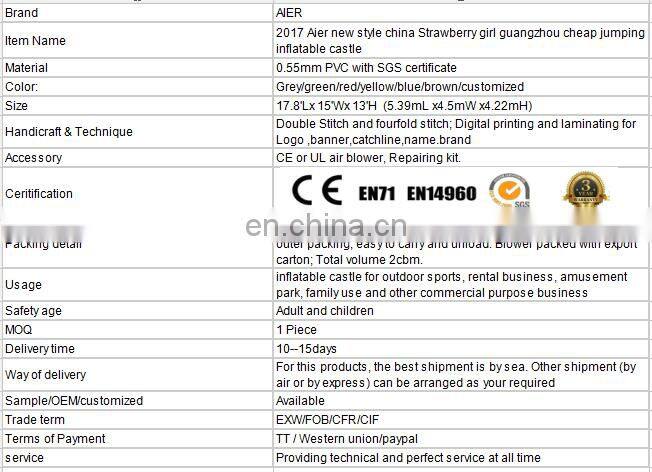 2017 Aier New Style China Strawberry Girl Guangzhou Cheap Jumping Inflatable Castle