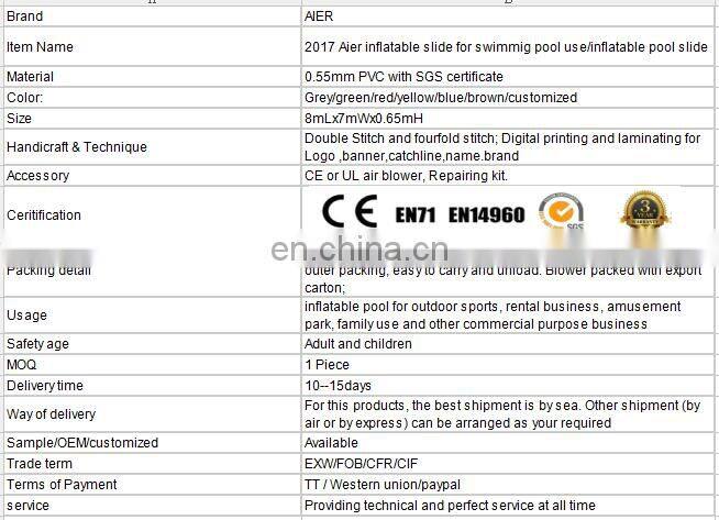 2017 Aier Inflatable Slide for Swimmig Pool Use/inflatable Pool Slide