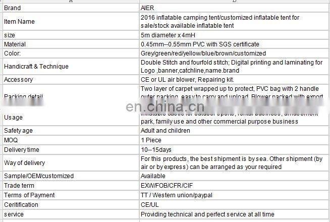 2016 Inflatable Camping Tent/customized Inflatable Tent for Sale/stock Available Inflatable Tent
