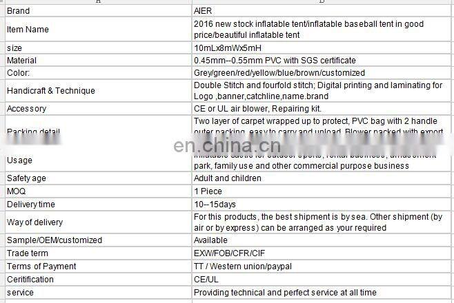 2016 New Stock Inflatable Tent/inflatable Baseball Tent in Good Price/beautiful Inflatable Tent