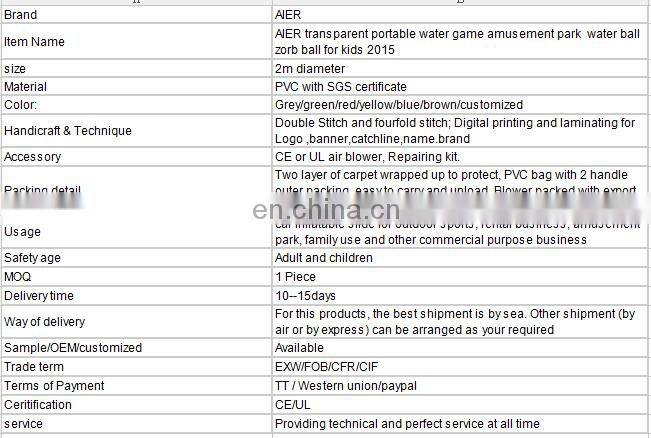 AIER Transparent Portable Water Game Amusement Park Water Ball Zorb Ball for Kids 2015