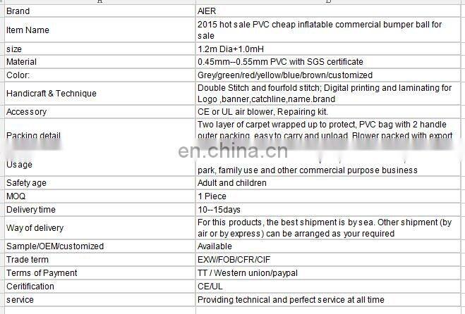 2015 Hot Sale PVC Cheap Inflatable Commercial Bumper Ball for Sale