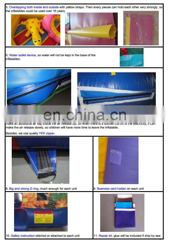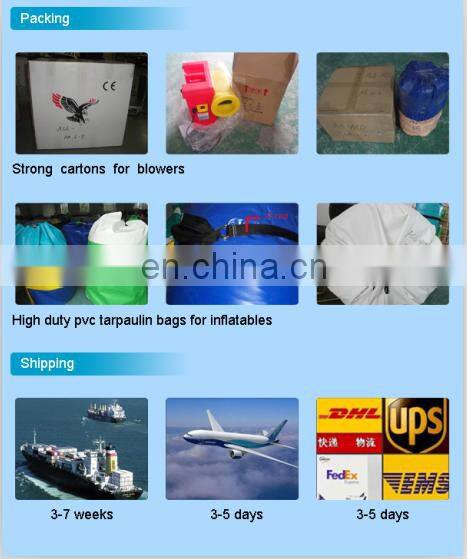 We promise you 2 years warranty for the pvc tarpaulin inflatable,1 year for the blower.