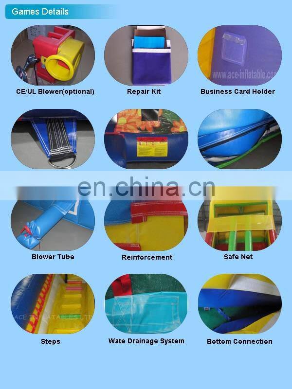1. Inflatable Games (castles, slides, combos, obstacles, sport games, ball pools, tunnels and more), material is 0.55mm 18oz PVC tarpaulin and the flame resistance conforms to British standard BS7837.