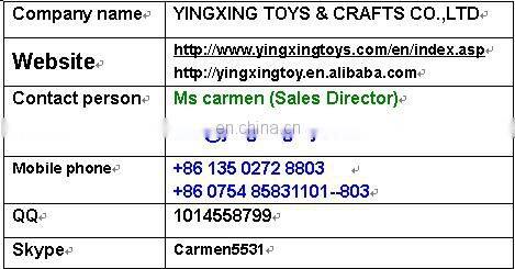 YINGXING TOYS & CRAFTS CO.,LTD is located in the domestic and well-known toy productionbase: Chenghai; Our showroom covers an area of more than 1000 square meters that gathers all kinds of the toys from nearly ten thousand toy and craft factories in Chenghai. At the same time,it owns advanced and professional talents in the managing and designing and marketing, and can offer various kinds of satisfied service to customer with our rich experience.