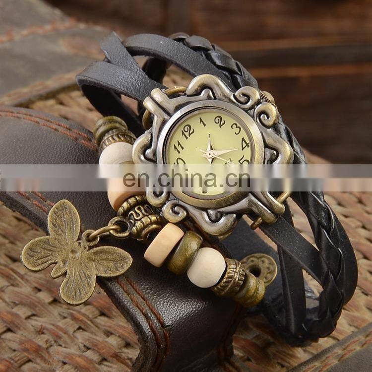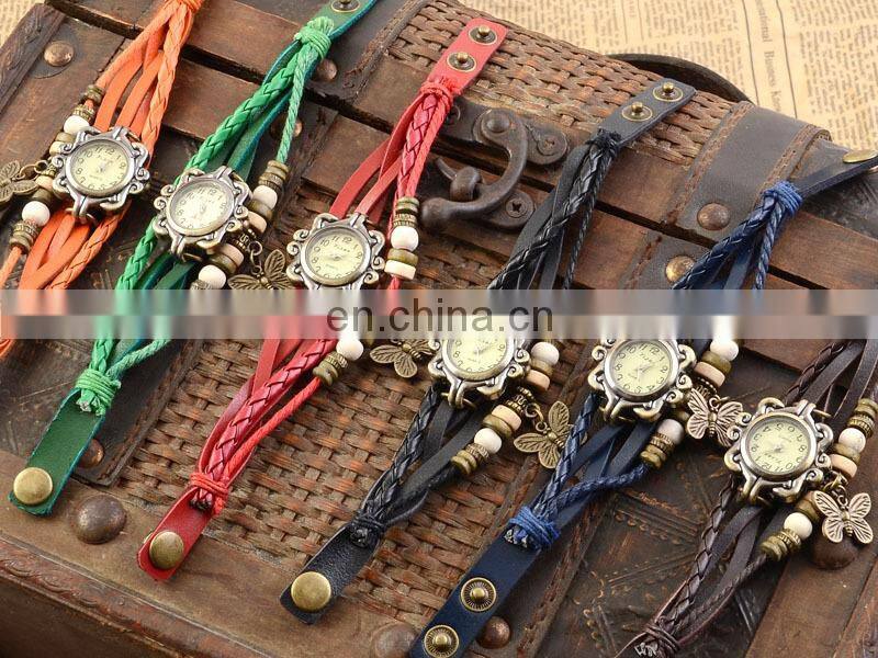 Ms Retro Hand-woven Imitation Leather Bracelet Watch Fashion and Colorful Butterfly Pendant Quartz Watch