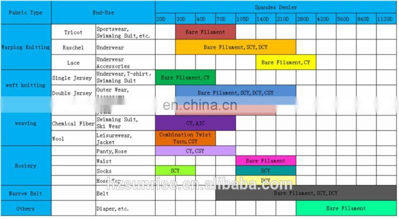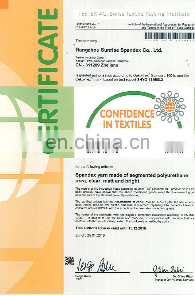 Sunrise is our brand of the spandex and the quality is also very high which is elastic filament. It not only has high elasticity, recovering power and high uniformity, but also has properties of high tenacity, high elongation and excellent durability. our products are well favored by customers since it was put on the market since 2004.