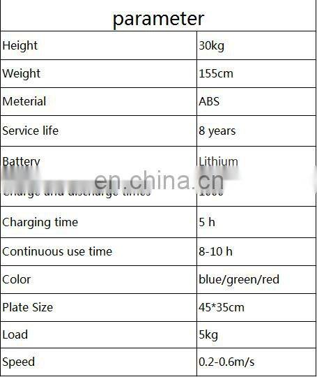 7. The parameters: the appearance of environmental engineering materials for the ABS, clear lines, a height of 1.55 meters, weighing about 30KG about meals at a time when the speed of about 0.5 m / s. . Design life of 8 years; 12V20AH automotive lithium batteries, charge and discharge 1000 times, 5 hours charging time, 8 to 10 hours of continuous use."