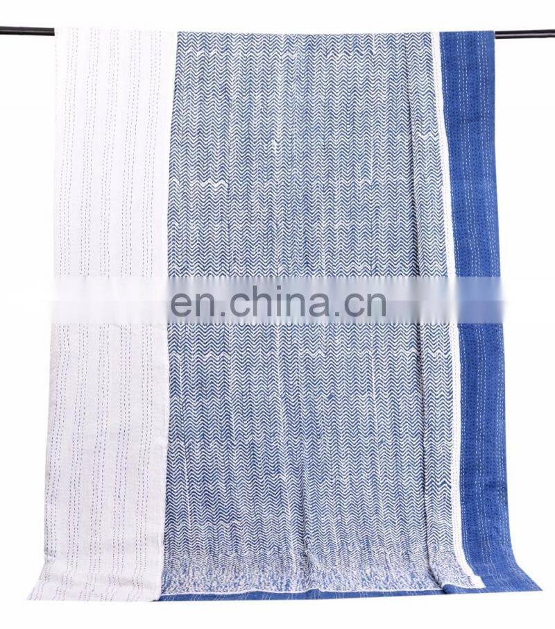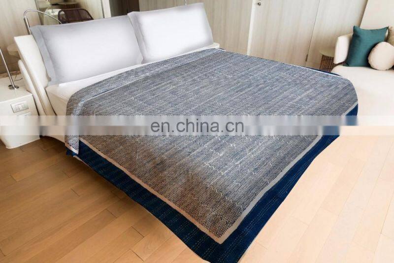 Indian Latest Indigo Blue Abstract Design Kantha Quilt Handmade Bedspread Throw Cotton Queen Size Blanket Patchwork Print