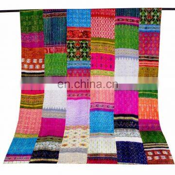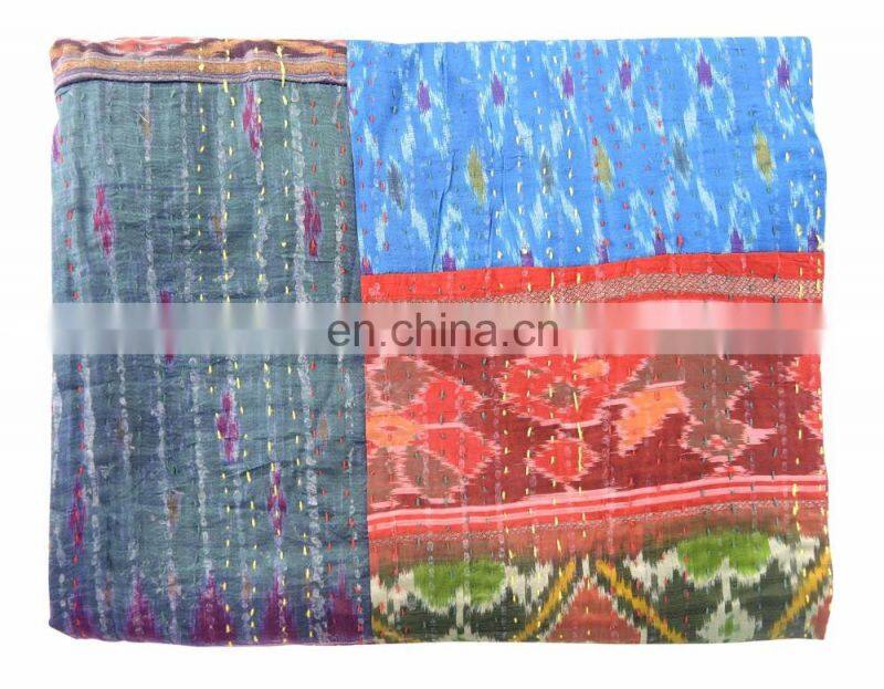 Indian Handmade Silk Saree Fabric Patchwork Kantha Quilt Queen Bedding Throw Reversible Bedspread