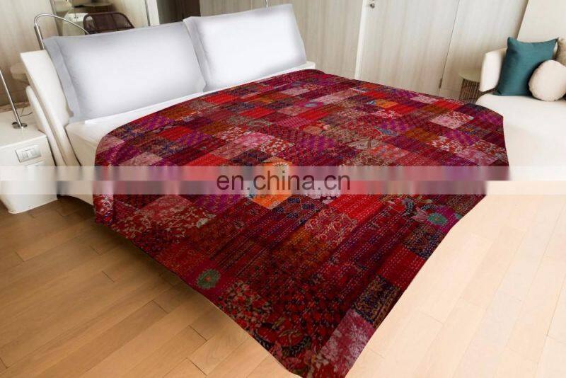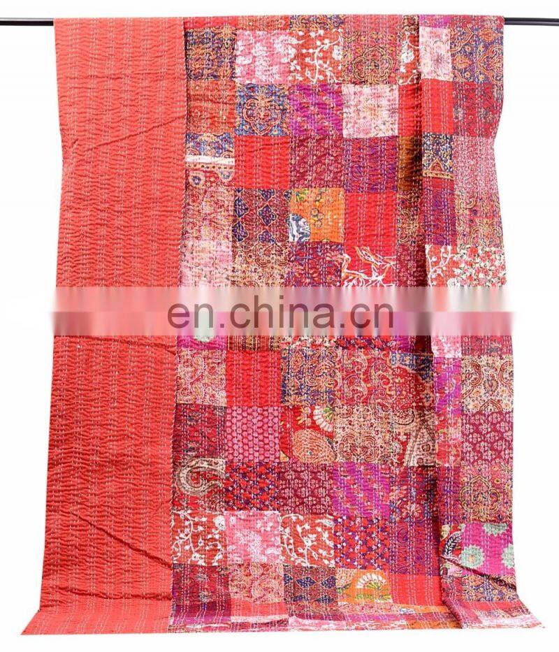 Indian Handmade Patchwork Kantha Quilt Bedspread Throw Cotton Queen Size Blanket